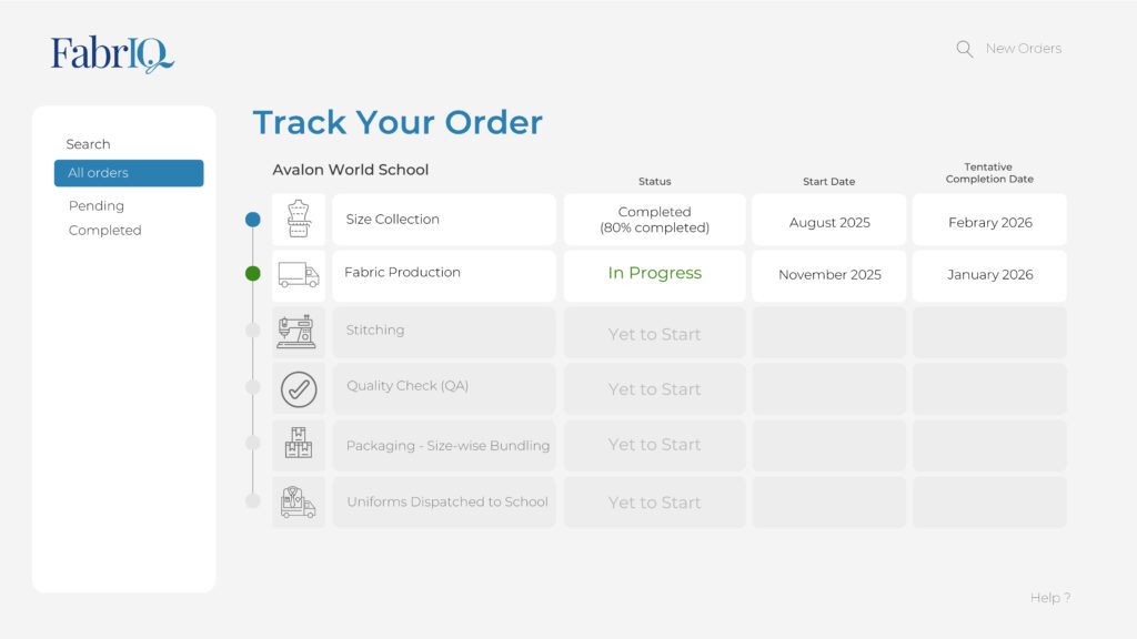 School admins get a live view of size-wise demand and order progress in real time.