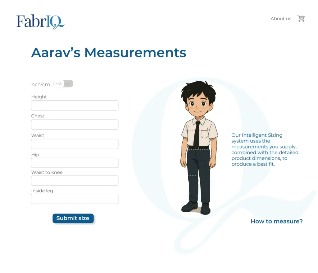 Understanding sizing is critical to successful schoolwear. We have developed an in-house Intelligent Sizing Tool through intensive R&D, built on real-world measurement data and pattern analysis. When parents register, they measure their children and enter these details into their account.  Combined with the detailed dimensions of all of our products, our algorithm is then able to accurately recommend the best fit for now and in a year’s time for each garment they require.